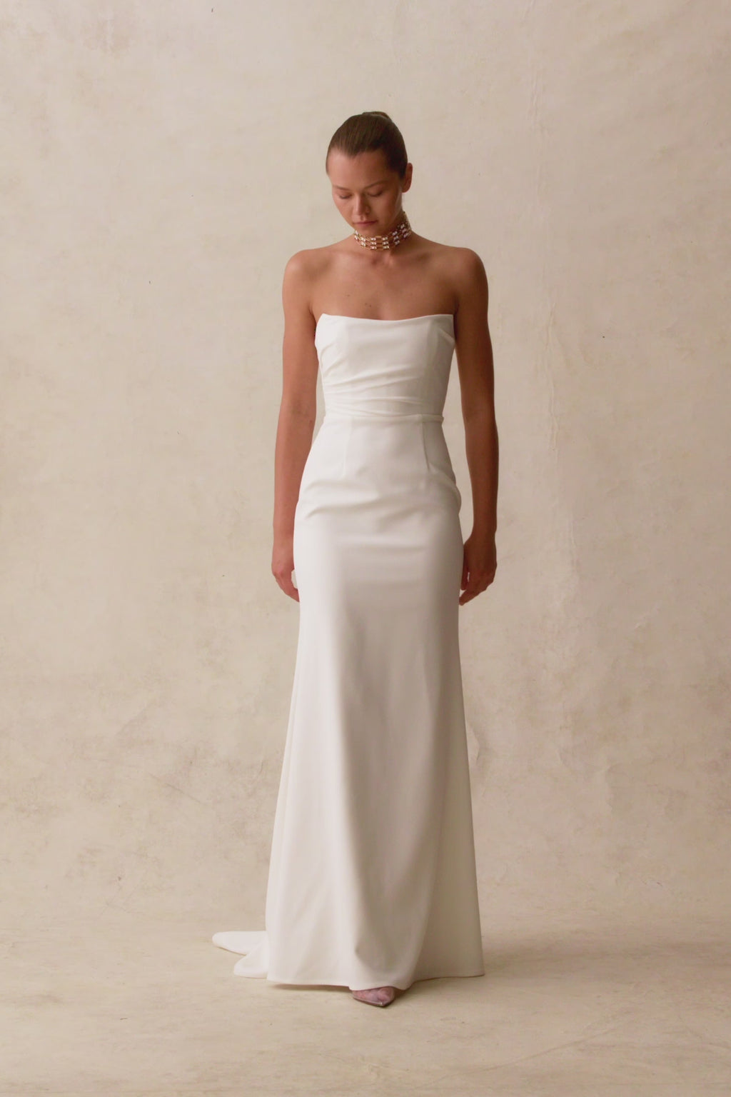 The Arlo Gown is a strapless silhouette designed as a timeless bridal classic. This silhouette features a square neckline with softly angled peaks to flatter the décolletage. Hand draped details adorn the bust and waist before falling to a floor grazing silhouette. This style is fit with an internal corset to define an hourglass shape.